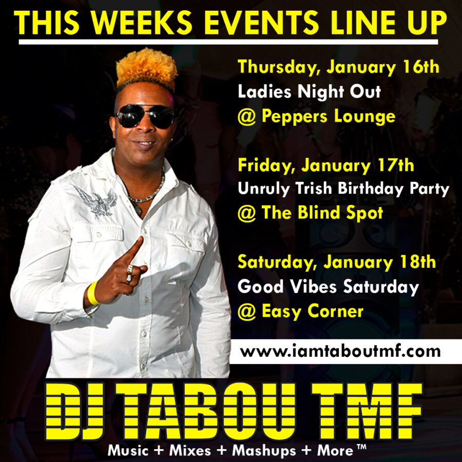 DJ Tabou TMF This Weeks Event Line Up Published January 14, 2025 at 900 × 900 in DJ Tabou TMF This Weeks Event Line Up Tweet Tweet Like this? Share it! Spread the Love 🙂TweetShare on Tumblr