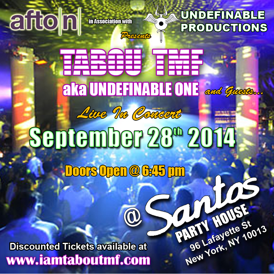 Come See Undefinable One aka Tabou TMF and guests Live in Concert September 28th 2014 at Santos Party House Get Discounted Tickets Now -> http://bit.ly/taboutmfsantos