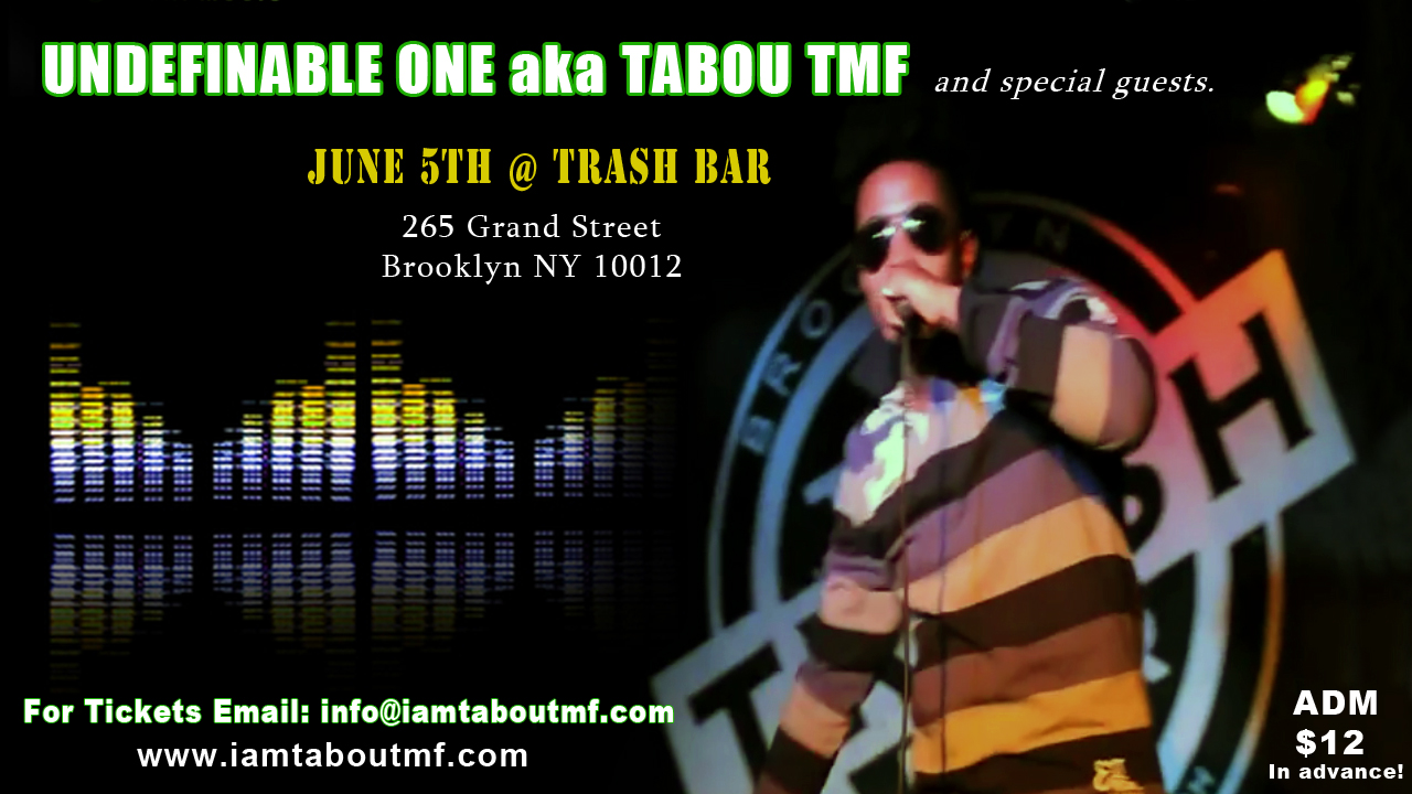 Undefinable One aka Tabou TMF and guests Live at The Trash Bar in Brooklyn, New York on June 5th 2014 Published May 18, 2014 at 1280 × 720 in Undefinable One aka Tabou TMF and guests Live at The Trash Bar in Brooklyn, New York on June 5th 2014 Tweet Come See Undefinable One aka Tabou TMF and guests Performing Live June 5th 2014 at The Trash Bar 256 Grand St, Brooklyn, NY 11211 Get Tickets Now -> http://bit.ly/tmf060514 Tweet Like this? Share it! Spread the Love 🙂TweetShare on Tumblr