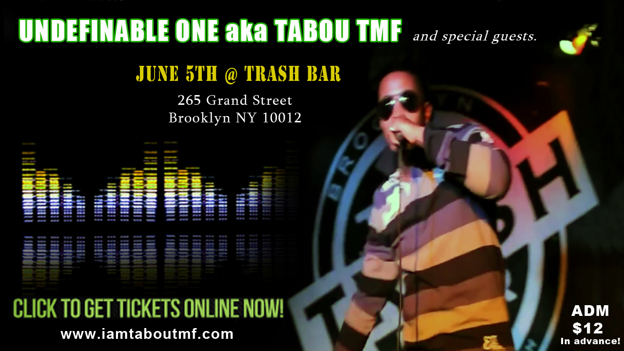 Come See Undefinable One aka Tabou TMF and guests Performing Live June 5th 2014 at The Trash Bar 256 Grand St, Brooklyn, NY 11211 Get Tickets Now -> http://bit.ly/tmf060514 | Use Promo Code: Undefinable345 at Checkout for Discount ** Before May 6th 2014 **